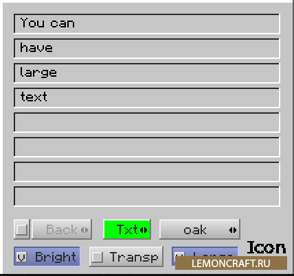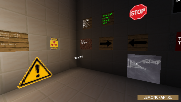 Мод на новые таблички SignTastic добавляет в игру несколько новых блоков, которые представляют собой плоский знак, табличку-плиту и полноблочную табличку. Данные блоки вы сможете самостоятельно настроить, на них помещается до 8 строк текста, а так же, они могут светится и быть прозрачными.
